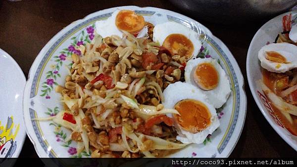 涼拌木瓜絲加鹹鴨蛋(比台灣的不鹹 蛋黃感覺較多)