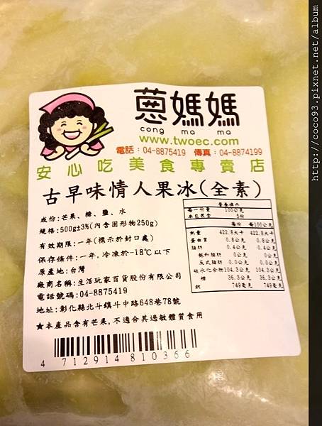 <蔥媽媽古早味情人果冰>成分/熱量/保存期限標示清楚,也貼心提醒對"芒果"過敏的人不適合吃