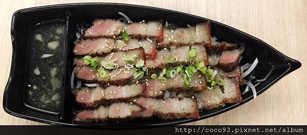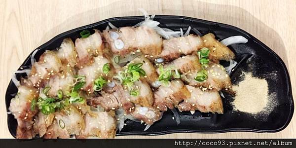 [鹽烤三層豬肉]$120,烤的火侯恰到好處,保留三層豬肉的鮮嫩,又收斂了油花,吃起來完全沒有油膩感,讓平常不吃三層豬肉的我,吃了好幾片