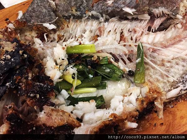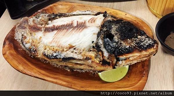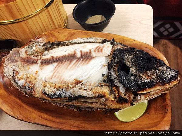 [馬告金蒜鹽烤台灣鯛]採用原住民原始烹調手法~把鹽抹在台灣鯛上,就直接烤來吃,密封住鮮魚肉的原汁原味