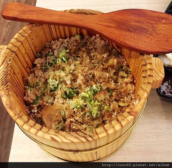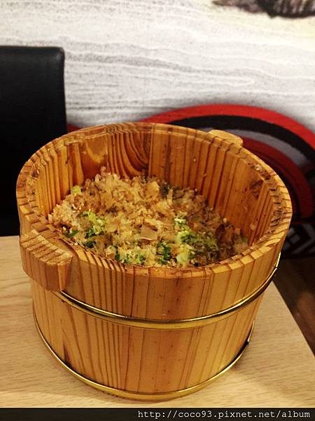 [烤魚木桶飯]是烤鮮魚肉+香蔥+柴魚,粒粒分明的炒飯,吃起來米香夠味,恩爸比和恩恩都好愛吃