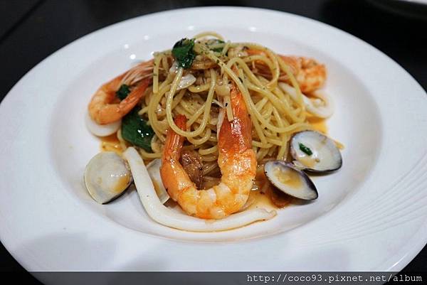 <香蒜海鮮義大利麵>$160,微濃蒜香襯托出海鮮清甜,我覺得<清炒風味>的義大利麵,較能吃出食材本質的美味