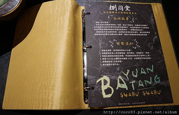 MENU的第一頁是『捌圓堂』品牌故事~『捌圓』命名的由來是老闆期許為人處事圓融、八面圓通,內心又不失方正,如銅錢一般外圓內方;給予每位顧客高檔、品質皆為首選的美味食材和賓至如歸的貼心服務,讓每次用餐都會是圓滿的回憶。