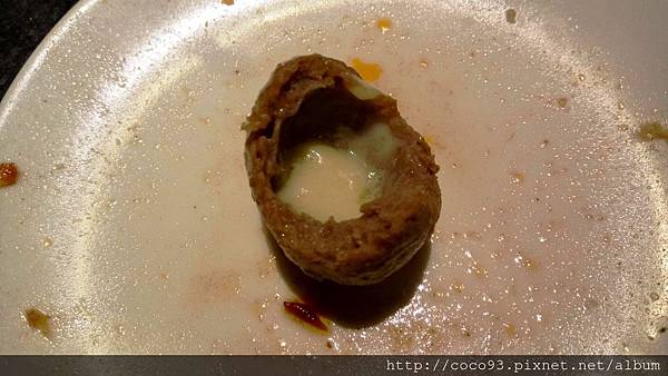 捌圓堂CP值最高的火鍋料~特製<起司牛肉丸>,口感彈牙,包著"莫札瑞拉起司"的牛肉丸一口咬下,是會爆漿的,濃郁的"莫札瑞拉起司"和"牛肉"混合後,讓口中充滿奶香及鮮甜味,好想多吃幾顆,雖然肚子已被hen多的和牛肉撐飽了.......