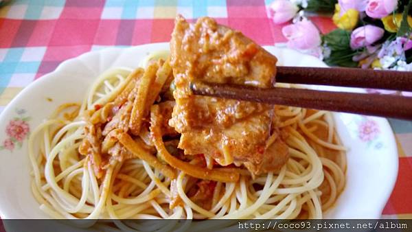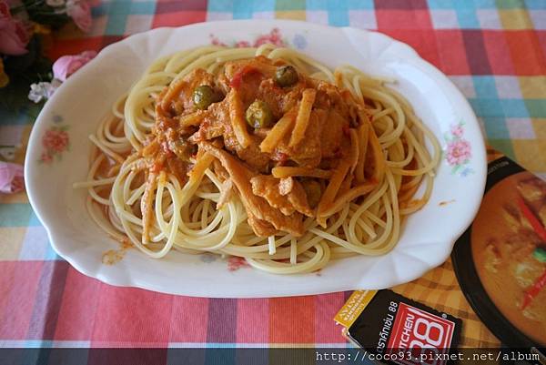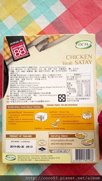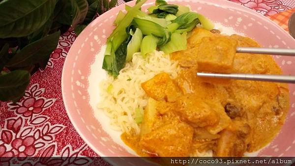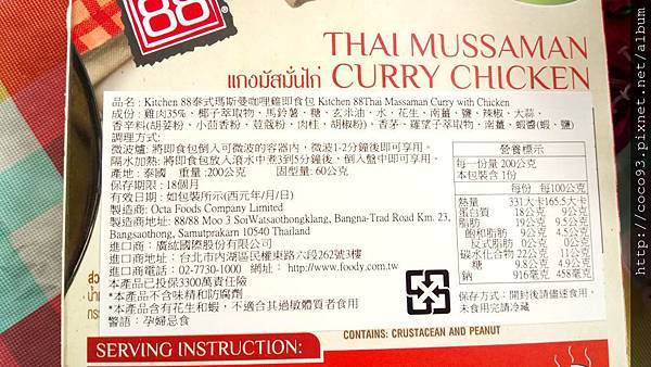我把<Kitchen 88泰式瑪斯曼咖哩雞>淋上川燙過的"媽媽麵"上,吃起來香料味道很重,後來看了成分,原來是加了南洋特有的"荳蔻粉",這味道不是很多台灣人可以接受的