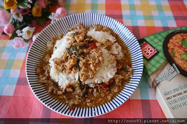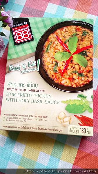 但因倒出來後,發現它不是乾炒型的,調理包內湯汁較多,所以決定把微波後的<Kitchen 88泰式打拋雞肉>直接淋在白飯上