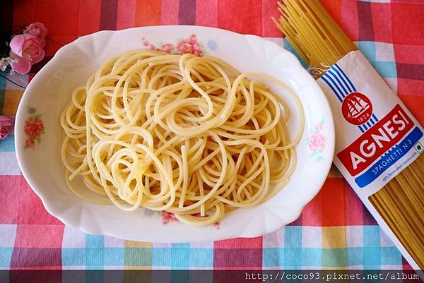 我又是隨性的抓了一把<Agnesi義大利麵N.3>,水滾後放入較深的鍋子中煮沸後,試吃其中一條麵條,感覺已熟後,撈起來放在盤中