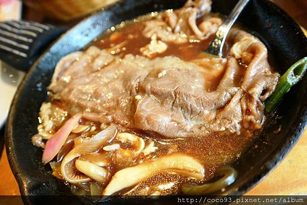 和牛肉質細緻多汁,5分熟度完美鎖住和牛肉片的鮮甜加上甜甜的日式壽喜燒醬汁,整個品嚐起來甜香無比,不重鹹!