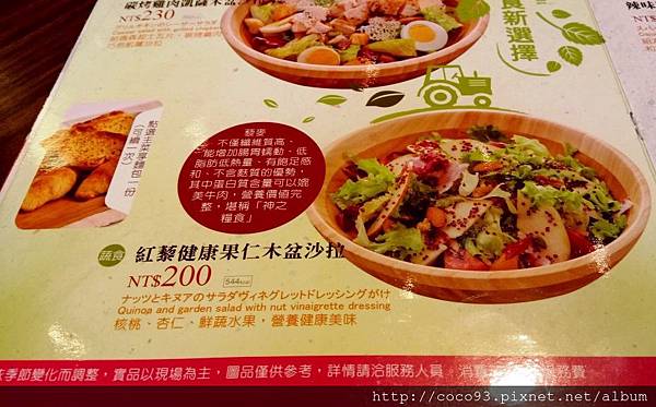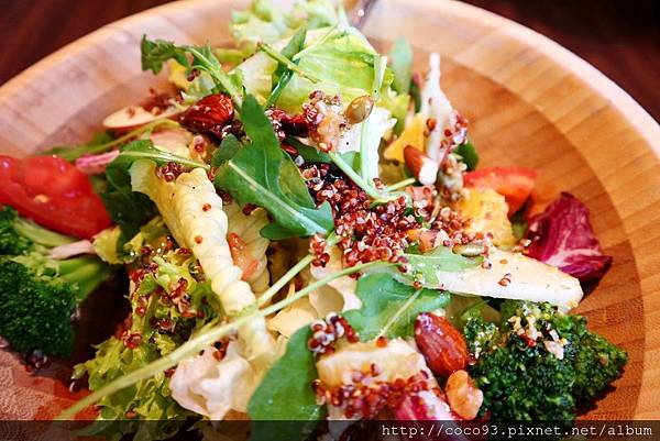 好大一盆<紅藜健康果仁木盆沙拉>各式各樣的蔬果,色彩超美,也灑滿了「穀類的紅寶石-紅藜」,紅藜可是近年來"養生&健康代表",深受女性及長者喜愛