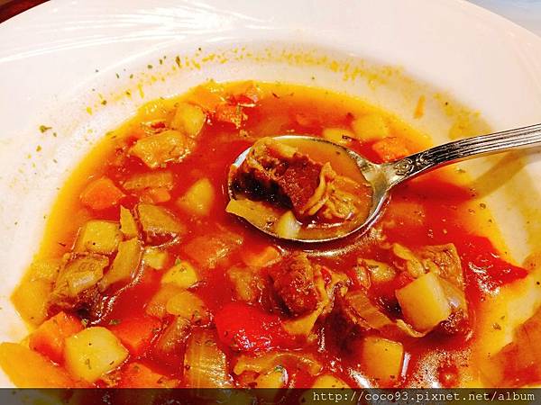 一向必點的<匈牙利牛肉湯>小塊牛腩甜嫩好咀嚼,蕃茄、洋蔥熬煮的湯頭,微酸帶甜,喝了好開胃