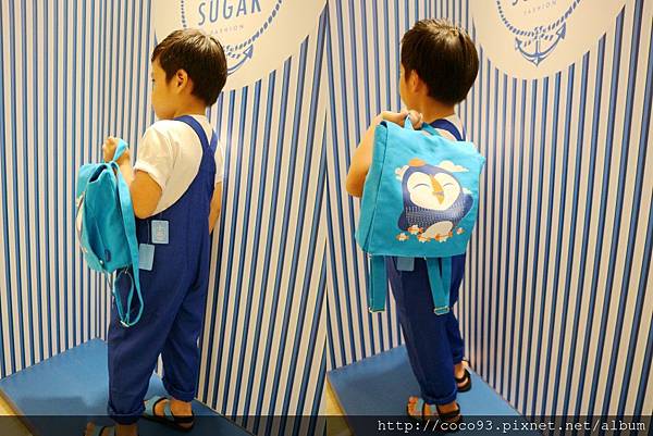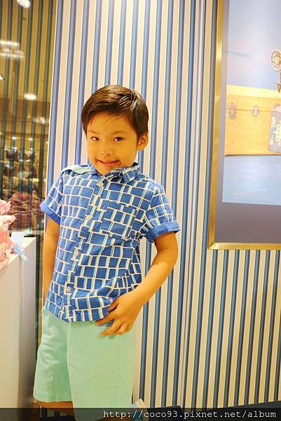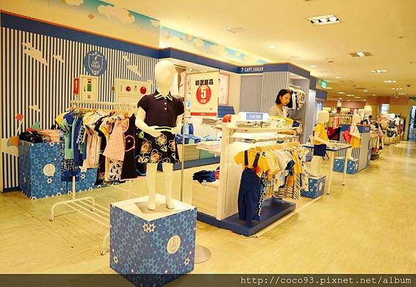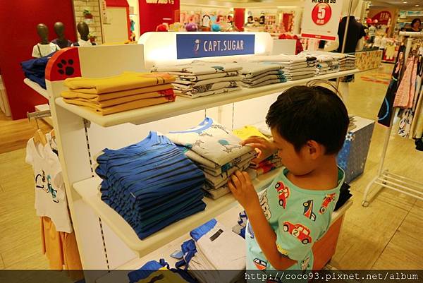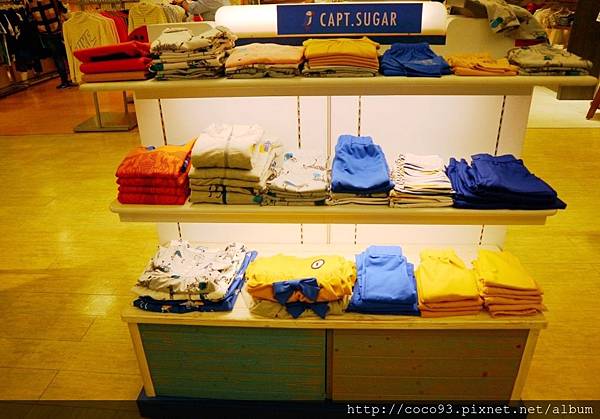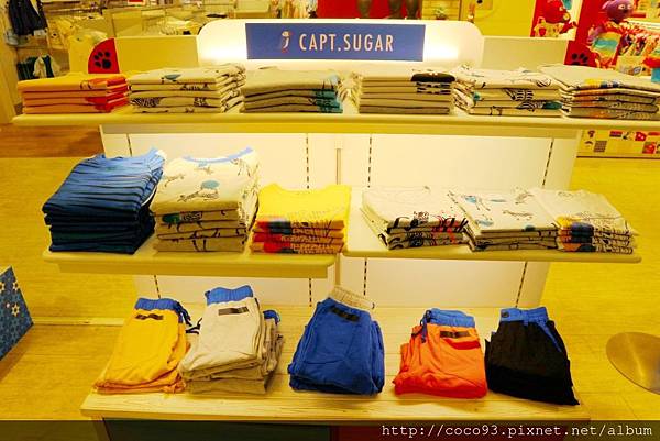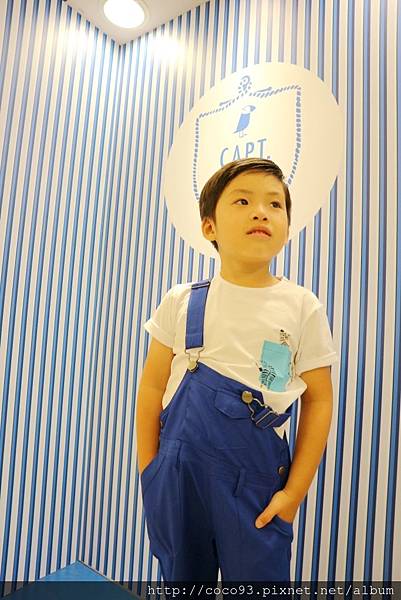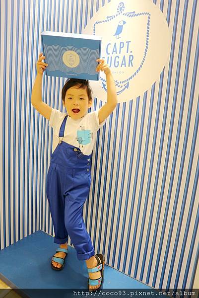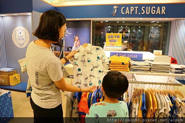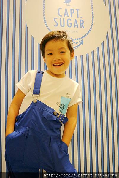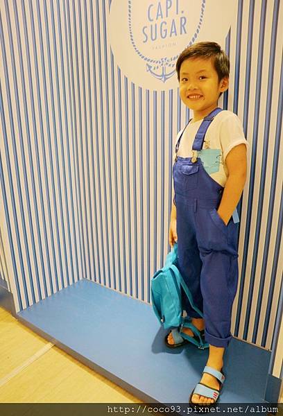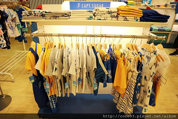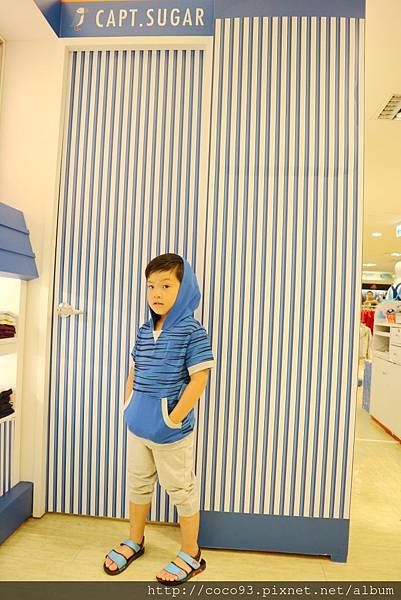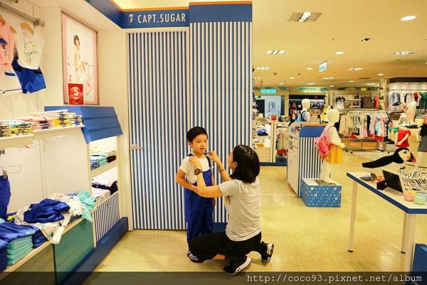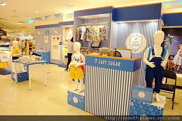 在桃園新光三越站前店8樓的『Capt.Sugar凱普頓時尙童裝』專櫃,一出電梯門就能看見,醒目的海洋風藍白條紋裝潢,很吸睛!
