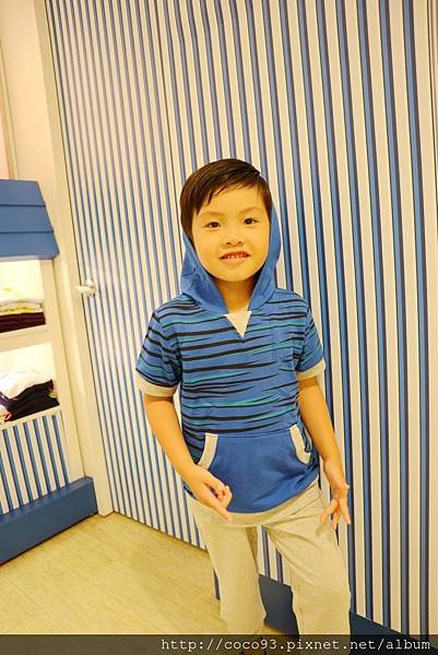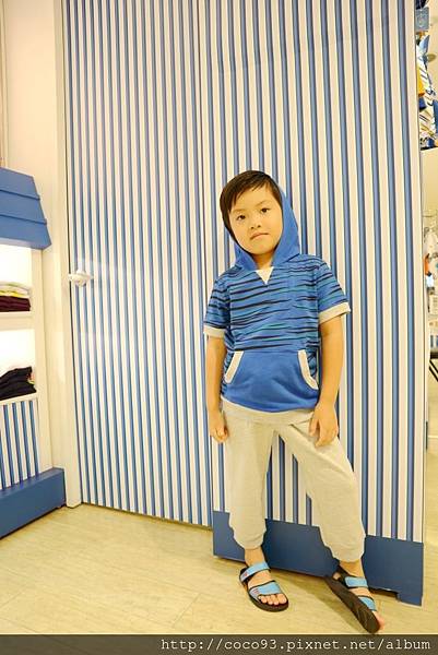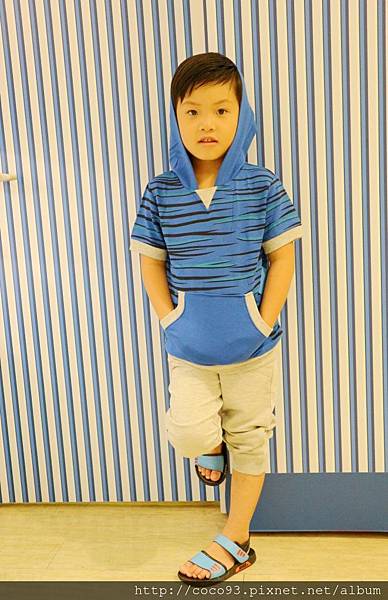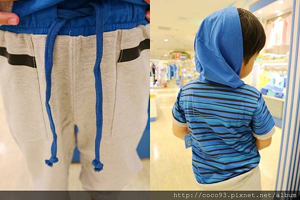 <斑馬休閒連帽短袖上衣-藍條紋+休閒毛圈運動長褲-灰>恩恩穿起來有點"痞",走休閒迷人路線