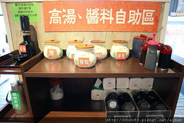 而且老闆很貼心在前後座位區都設有<高湯、醬料自助區>,讓客人不用走太遠