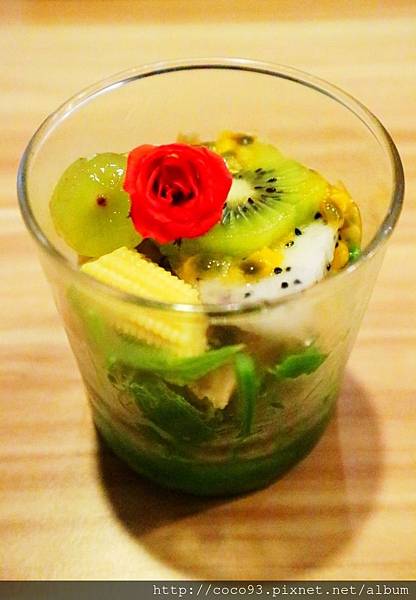和風沙拉~配色繽紛,層次分明,上層舖有數種新鮮蔬果~火龍果、奇異果、龍鬚菜、小玉米等