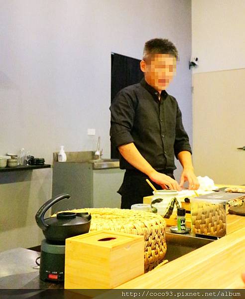 老闆也是師傅,已在料理台準備食材了(他很害羞,不想露臉,只好馬賽克了)