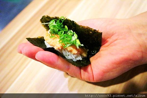 鮪魚手卷,老闆將鮪魚的骨邊肉刮成泥狀,加上青蔥去腥,吃了一口,口感好細密