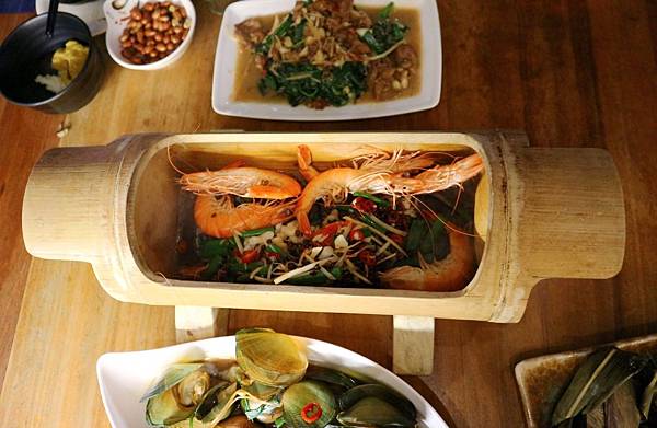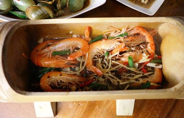 <竹筒石頭蝦>$480,以石頭加溫,內含了馬告(山胡椒)、青蔥、薑絲等辛香料提味,蝦肉Q彈紮實,鮮甜多汁,讓人吮指!