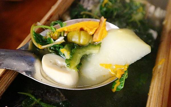 因為放了不少原住民常吃的野菜:輪胎(車輪)、大頭根、木鱉子、山苦瓜一起燉煮
