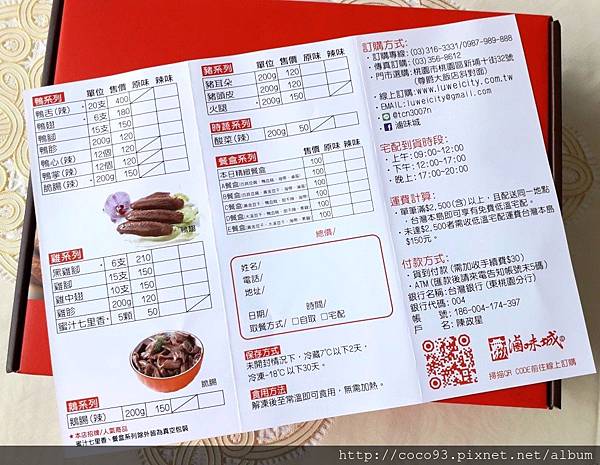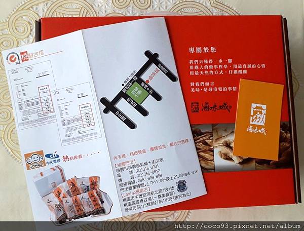 『滷味城』滷味禮盒內,附有訂購單和名片,訂購方式寫得很清楚(如下),並秀出SGS檢驗合格,可以安心食用