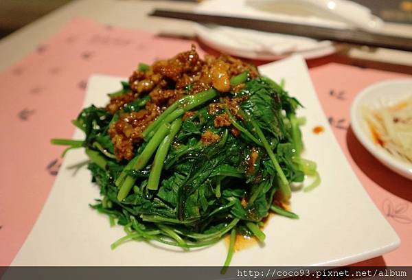 <今日時蔬>香噴噴、油亮亮的肉燥,讓平凡稚嫩的空心菜變美味搶手,姐妹們一動筷子後,一會兒就見底了