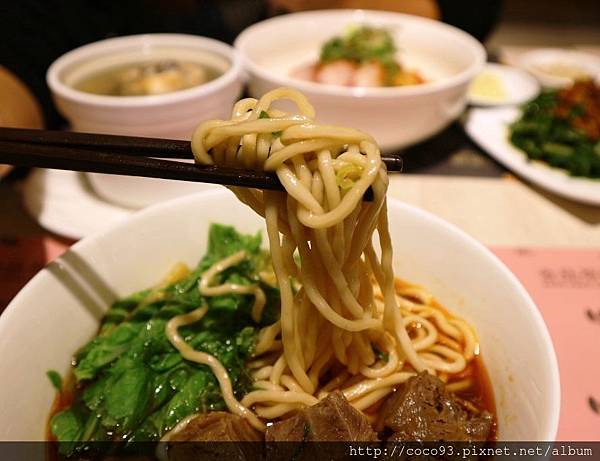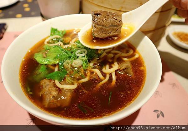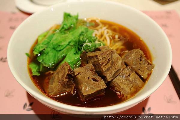 <經典紅燒牛肉麵>採用口感紮實的牛腱肉,一碗有5、6塊之多,湯汁甜美不鹹,屬於口味較清淡的紅燒,手工拉麵Q彈有嚼勁