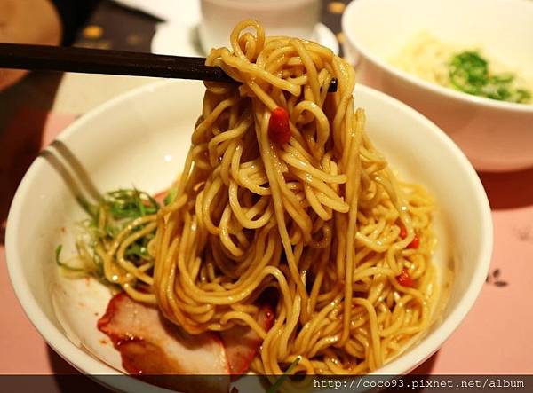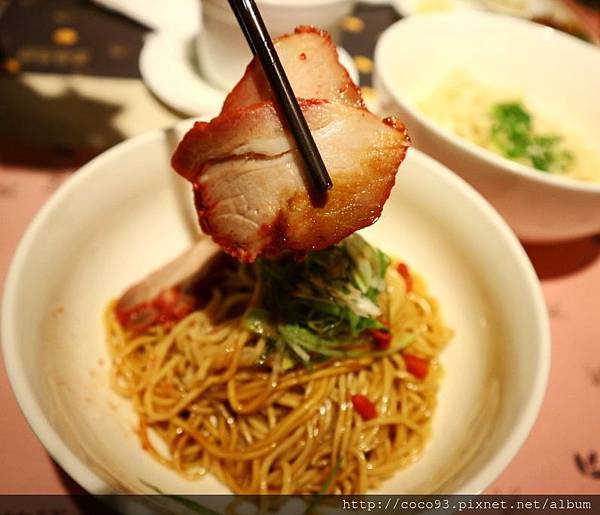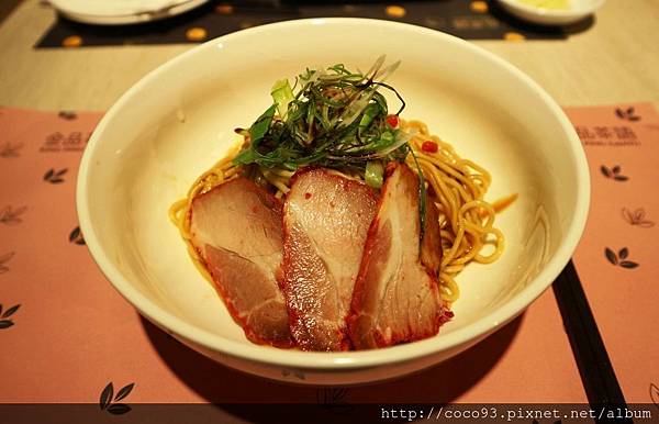<紅糟豬肉黑糖麻油麵>紅糟肉有著黑糖特殊香氣,咀嚼時滿口甜汁,彈韌的手打麵拌著濃郁的老薑麻油味