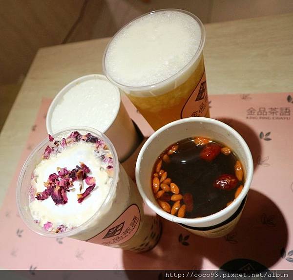 套餐精選飲料(左上)<經典鍋煮紅水烏龍奶茶>/(右下)<紅棗枸杞茶>用外帶杯裝很可惜,沒能看到漂亮的紅烏龍茶色