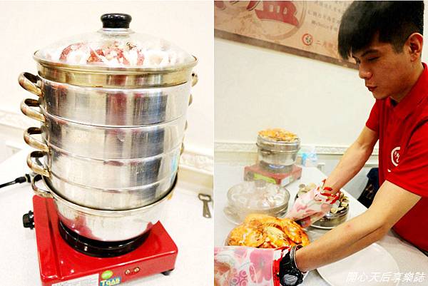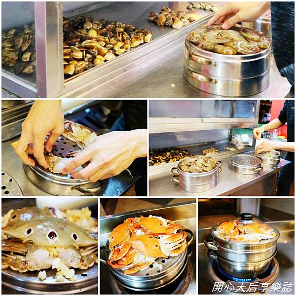 點了四小層海鮮塔後,師傅就開始動手擺放每層的海鮮,再放上火爐蒸煮