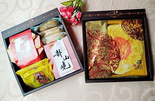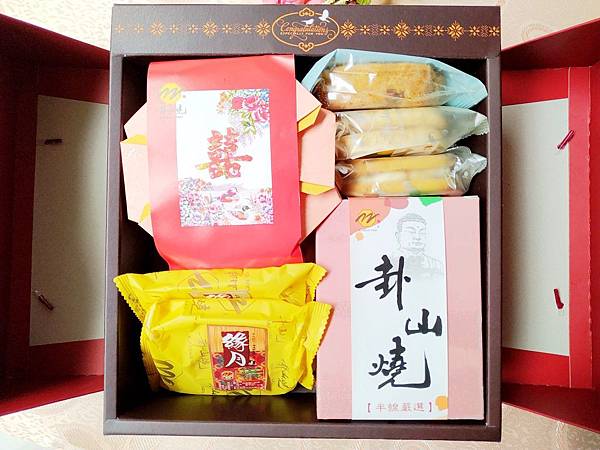 『彰化卦山燒喜餅』打開來是上下兩層的喜餅,第一層是中/西/日式餅乾及點心,第二層是中式大餅