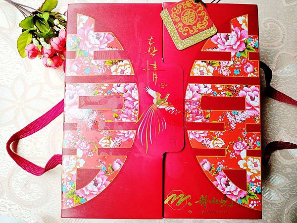 正紅色外盒加上盒面上有著古早花布的喜字各佔一邊,包裝十分精美別緻!