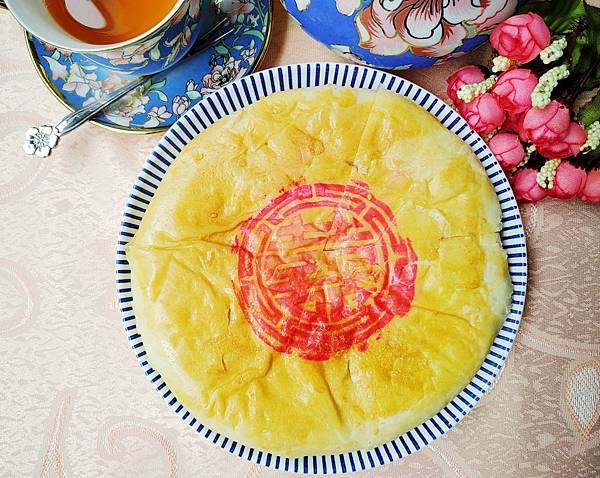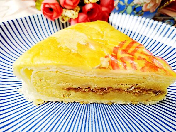 <緣月燒>糕餅外皮,表皮光滑,吃起來順口不口乾,不需搭配飲料,牛奶味的內餡,瀰漫香醇奶香及白豆沙香氣,是一款讓長輩呷意的點心