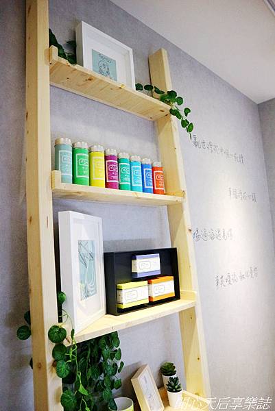 同時也是一面很吸睛的"草本打卡牆",木架上的茶葉罐及周邊商品,都十分有創意且別緻