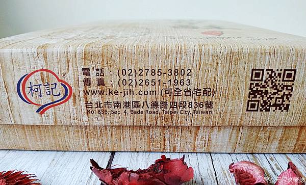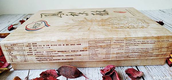 <柯記鳳梨.鳳黃酥雙拚禮盒>木紋質感外盒,側邊清楚標示產品相關資訊