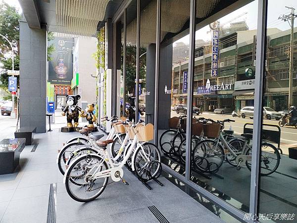 『璞樹文旅TREEART HOTEL』門口的黑金雙熊及造型別緻的綠意外觀很吸睛,有腳踏車供旅客免費使用