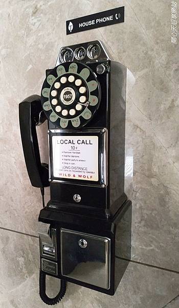 樓層電梯門口,設有1950年英式餐廳三投幣孔復古公共電話,品味非常