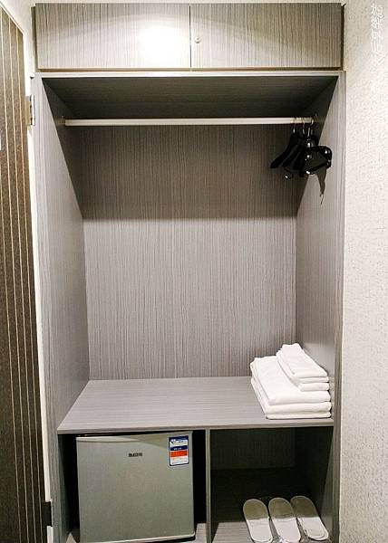 玄關處有木質開放式衣櫃,放有乾淨的大小毛巾,並附有小冰箱、紙拖鞋
