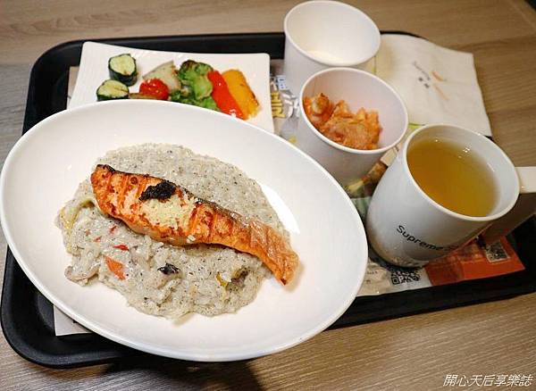 <松露嫩鮭野菇燉飯>$358,可加價升級成套餐,A餐加$10~黃金玄米茶,B餐加$30~黃金玄米茶+大鮮沙蔬沙拉(+$25換購義式烤鮮蔬)