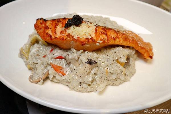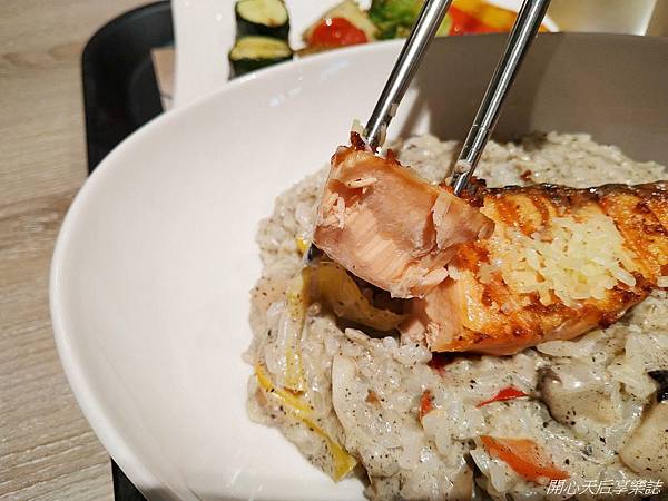 <松露嫩鮭野菇燉飯>散發奶香與松露濃郁的雙重香氣,配上大塊的厚切現烤鮭魚菲力,讓人垂涎