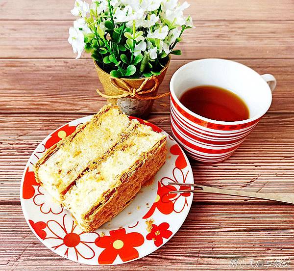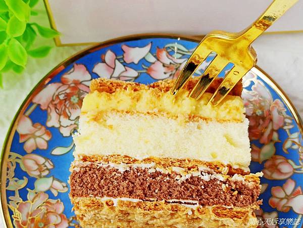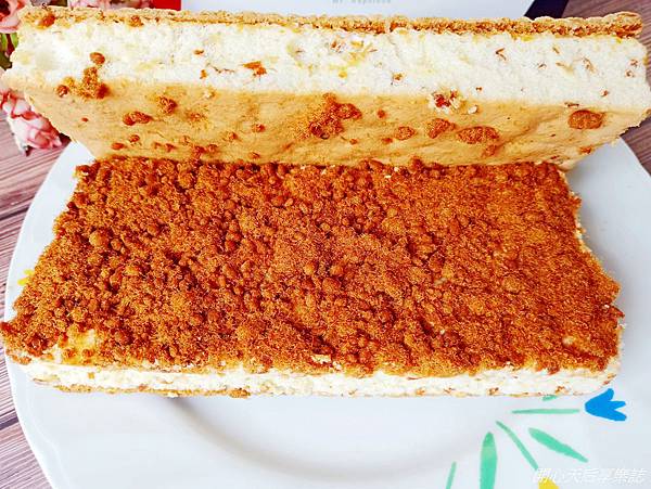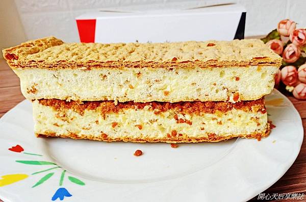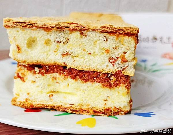 上面一層拿破崙派特有的千層酥脆派皮,上下兩層是香草蛋糕,香草蛋糕裏嵌有不少肉紙,中間一整層則是舖著滿滿的寶兒細肉鬆,看了讓人流口水
