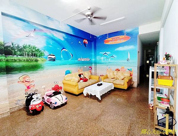 客廳的海灘玩樂彩繪牆,活潑有朝氣,加上黃色沙發及擺放的米妮娃娃,很好拍