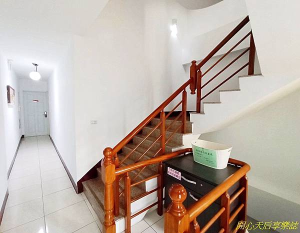 樓梯間一隅,擺放小毛巾、浴巾回收籃及備用衣架木櫃