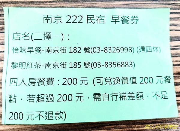 『南京222民宿』提供四人房$200的早餐券,並提供二家附近的早餐店,可以自由選擇