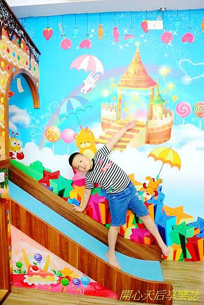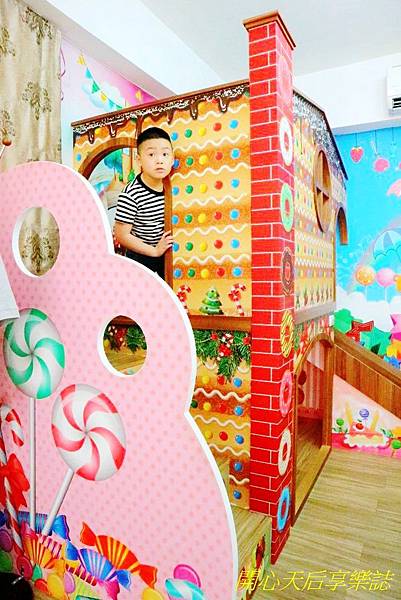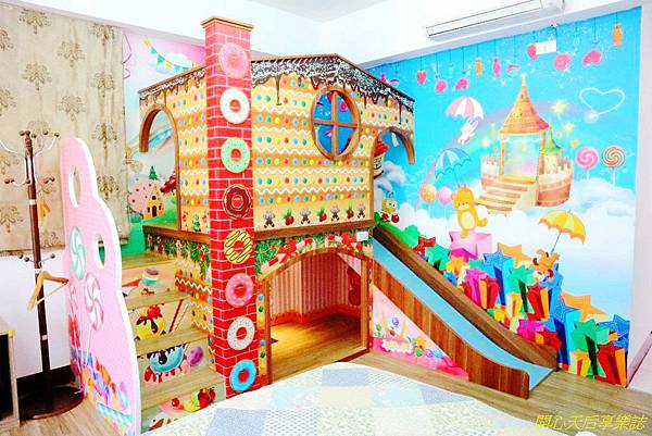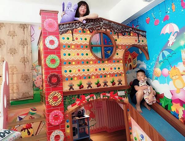 最讓我們興奮的,當然是房內大型的糖果屋溜滑梯,,色彩繽紛,圖案逼真可愛,彷彿置身在童話中的糖果屋,超好拍!