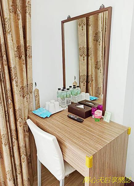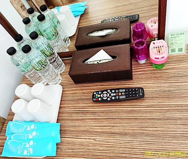 化妝桌上備有牙刷、漱口杯、礦泉水、電蚊香、小夜燈,全館都有WIFI,訊號強不累格