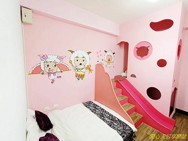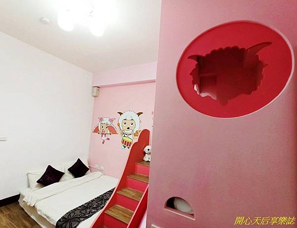 房間的一半空間就是擺放人氣卡通羊多種笑臉圖案的溜滑梯,中間有著隱藏式小床,恩恩驚喜的說:「媽咪,我想住在這個秘密基地裏!」(哈,下次再來住)