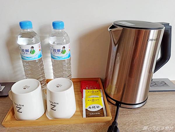 木櫃上擺有免費礦泉水、茶包、馬克杯、電煮壺