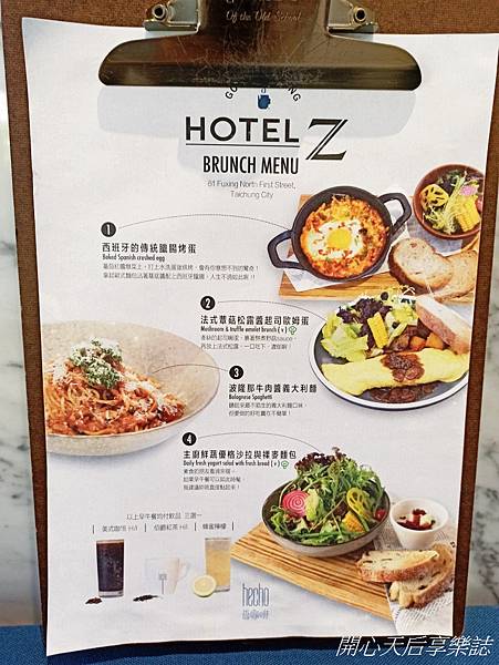 『Hotel Z』早餐提供『hecho做咖啡』超人氣的早午餐,供應時間是上午7:00~10:00,房客早餐四選一(定期更換菜單,以現場提供為準),都附飲料三選一~美式咖啡(冷/熱)/伯爵紅茶(冷/熱)/蜂蜜檸檬(冰/少冰/去冰)