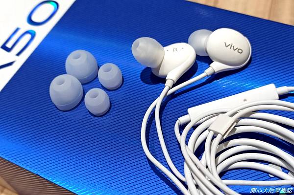 『vivo X50e』專屬耳機,造型別緻,戴起來很舒服,戴久不會痛,還附大小耳機套各一付,方便更新,對於有潔癖的我來說,好大心