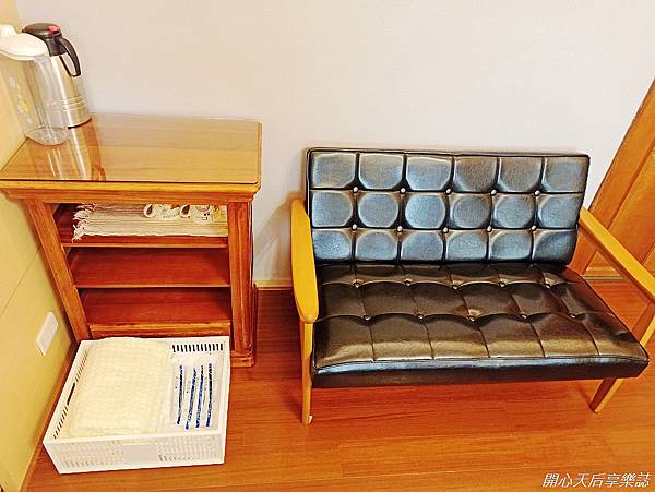 擺設美式雙人沙發,木桌上放置冷水壺、保溫壺、馬克杯
