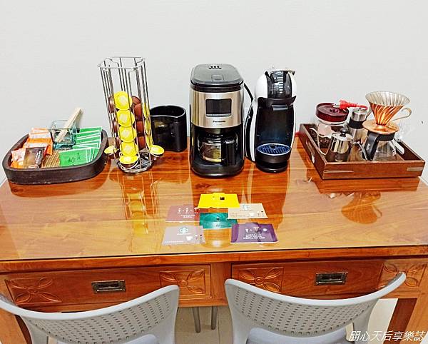 餐桌上擺有茶包、即溶咖啡包也有咖啡豆、磨豆機、手沖咖啡器具及膠囊咖啡機、美式咖啡機,讓旅客自行飲用